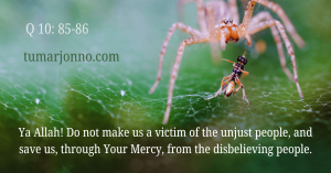 ইয়া রব, জালিম লোকদের দিয়ে আমাদের শক্তি পরিক্ষা করাবেন না। আর আপনার অনুগ্রহে কাফের লোকদের হাত থেকে আমাদের রক্ষা করুন।